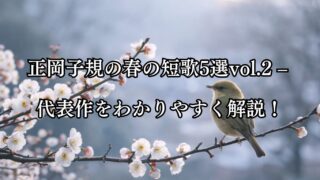 正岡子規 正岡子規の春の短歌5選vol.2 – 代表作をわかりやすく解説! 正岡子規の春の短歌5選vol.2を、代表作とともにやさしく解説。シリーズで楽しめる、春の情景と子規のまなざしを紹介します。 2026.02.13 有名歌人一覧正岡子規短歌