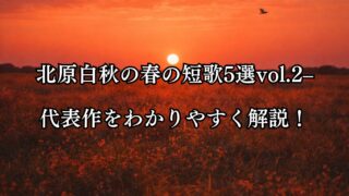 有名歌人一覧 北原白秋の春の短歌5選vol.2–代表作をわかりやすく解説! 北原白秋の春の短歌5選vol.2。光や香り、胸さわぎにゆれる春の情景を、わかりやすく解説します。シリーズで読む白秋の春の世界。 2026.03.02 北原白秋有名歌人一覧短歌