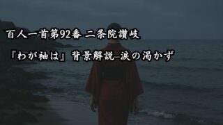 百人一首 百人一首第92番 二条院讃岐『わが袖は』背景解説–涙の渇かず 百人一首第92番 二条院讃岐「わが袖は」を背景とともに解説。乾くことのない袖に託された、秘めた涙と恋心の深さを読み解きます。 2026.01.22 和歌百人一首